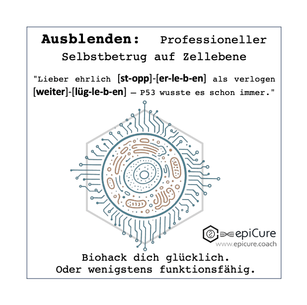 Typische Reaktion: noch mehr Selbstbeschwichtigung. Du rationalisierst (“Ist halt so”), vergleichst dich nach unten (“Anderen geht’s schlechter”), verdoppelst den Optimismus (“Positiv denken!”). HSP-Gene (molekulare Stress-Feuerwehr) laufen auf Dauerbelastung. mTOR bleibt aktiv – du funktionierst weiter, ohne innezuhalten. Deine Autophagie-Gene schweigen, während toxische Muster sich festsetzen. Der Körper entwickelt somatische Symptome: Kopfschmerzen, Schlafstörungen, Verdauungsprobleme – die Sprache verdrängter Wahrheit.