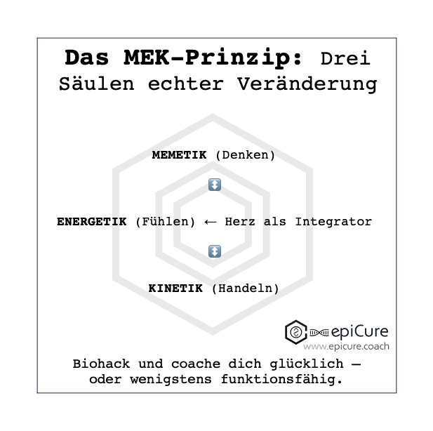 < /|\ > Das solltest du wissen: Memetik erklärt, wie Ideen und Glaubenssätze sich verbreiten (kulturelle Viren). Energetik zeigt, wie Emotionen Energie erzeugen oder blockieren (Herz sendet Neuronen ans Gehirn). Kinetik beweist, dass Bewegung deine Hormone, Neurotransmitter und sogar Gene beeinflusst (z. B. 20 Minuten Joggen → Endorphine ↑).